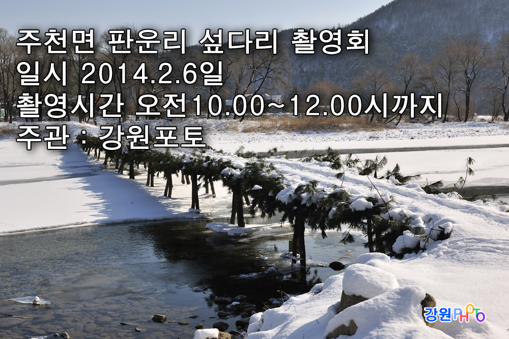 2014.02.04 00:27 조회 : 2,648 주천면 판운리 섶다리 촬영회 장소 : 주천면 판운리 섶다리 일시 : 2014.2.6일 오전10:00~12:00까지 행사내용 : 정선아리랑 체험 촬영 지게꾼 행렬 정선아리랑 행렬 물동이나르기 행렬등 문의 : 010 -3589-7852 페이스북 트위터 요즘 미투데이 작성자 : 강원포토(heart707) 쪽지보내기