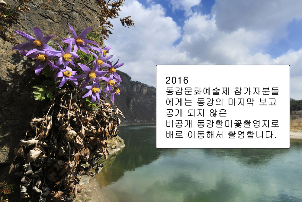2016.3.26.일 행사안내 | 제2회 동강문화예술제 행사안내 09:00 : 동강할미꽃촬영 10:00 : 동강민속연출 / 목욕신, 빨래하는장면, 물놀이 동강민속연출 12:00 : 중식(당일참가자 중식제공) 13:30 : 동강의메아리 / 동강의비경 절벽를 무대로 모듬북 창작 공연 14:00 : 동강의어부 / 고기잡는 아낙네 14:30 : 동강의수채화 / 동강을 배경으로 나들이 하는 동강 처녀 총각 시연 15:00 : 동강인의삶 / 동강길을 따라 밭갈이하러 가는 동강인의삶 시연 15:30 : 동강아리리 / 동강인의삶을 구성한 춤사위 16:00 : 동강의소리 / 정선아리랑공연 16:10 : 동강민속퍼포먼스 18:00 : 석식 19:00 : 팀별 세미나 |