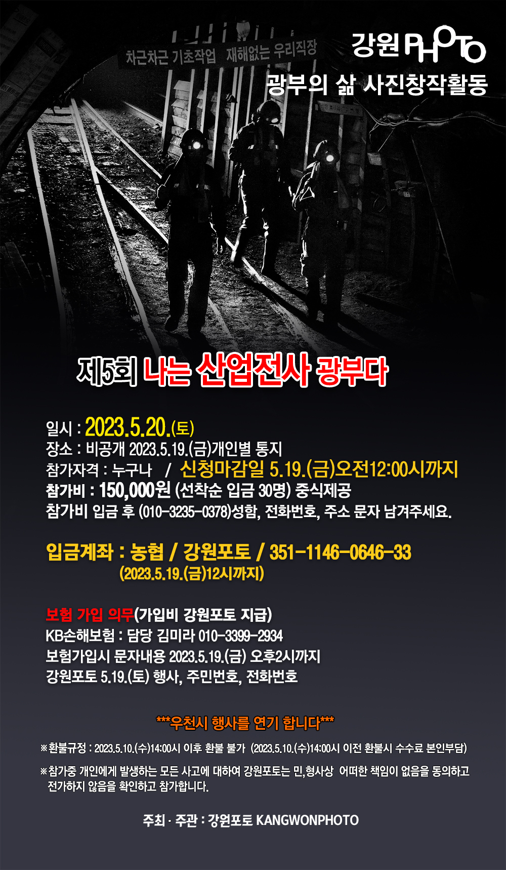 2023.05.11 21:40 조회 : 1,141 제5회 나는 산업전사 광부다 제5회 나는 산업전사 광부다참가자 접수 목록01.한**02.지**03.김**04.김**05.김**06.천**07.서**08.이**09.윤**10.우**11.임**12.최**13.임**14.이**15.참가자분들은 보험 접수를 꼭 하시기를 바랍니다. 2023.5.19.(금) 장소를 문자로 안내해 드리겠습니다.촬영일시 : 2023.5.20.(토) 오전 7시까지 페이스북 트위터 요즘 미투데이 작성자 : 강원포토(heart707) 쪽지보내기
