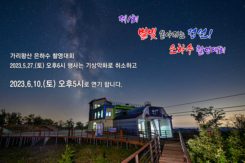 2023.05.26 20:37 조회 : 929 2023.5.27._제2차 가리왕산 케이블카 은하수 촬영대회 2023.5.27._제2차 가리왕산 케이블카 은하수 촬영대회 6.10.일자 연기합니다 5.27.~5.28.(1박2일) 가리왕산 은하수 촬영은 기상 악화로 인하여2023.6.10.(토)~6.11.(일)자로 연기합니다. 참가 안내는 추후 공지하고 전달하겠습니다. 페이스북 트위터 요즘 미투데이 작성자 : 강원포토(heart707) 쪽지보내기