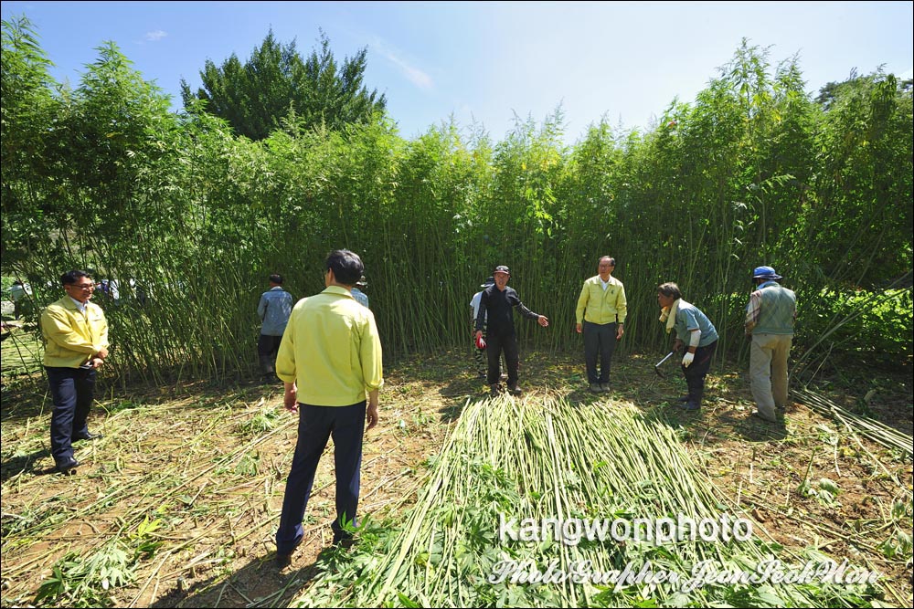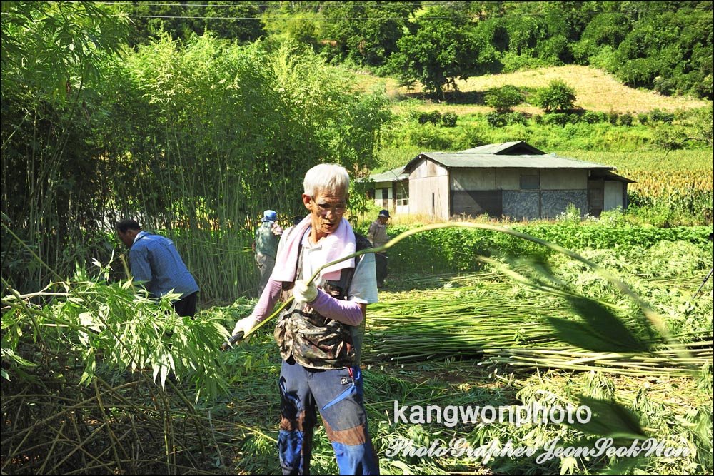 동네 주민들이 모여 삼을 베는 일에 모두 열정적으로 참여하고 있습니다