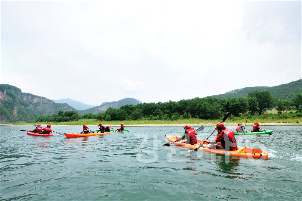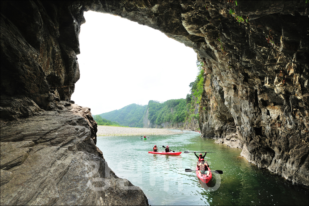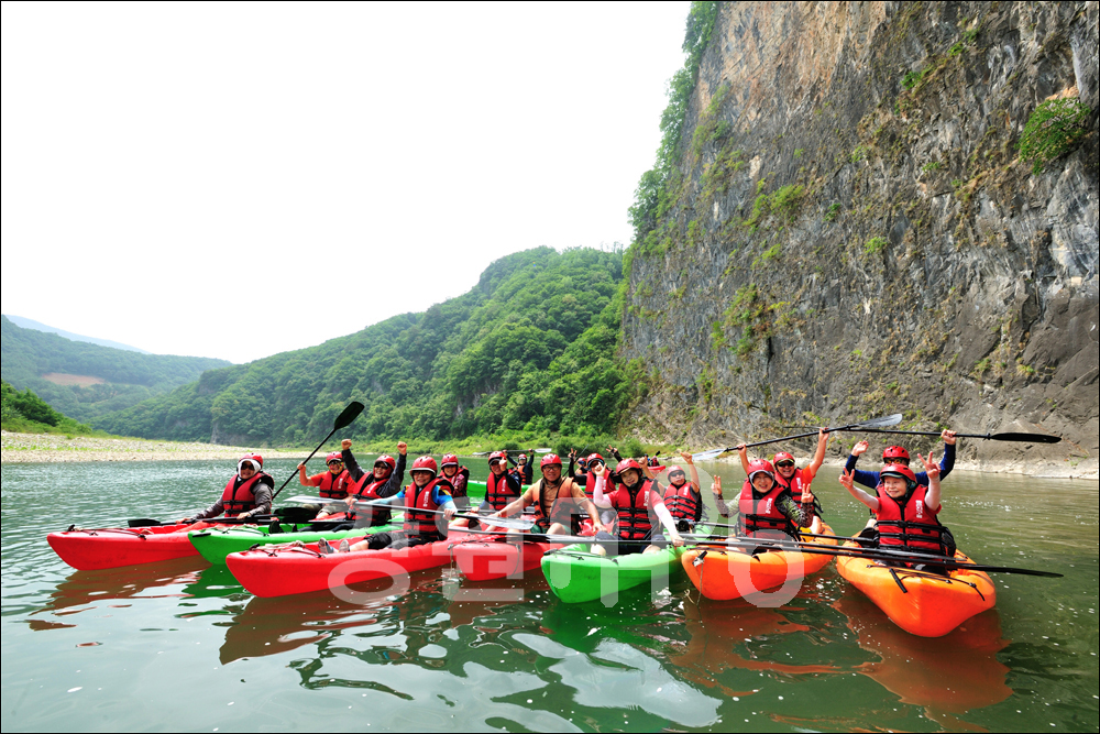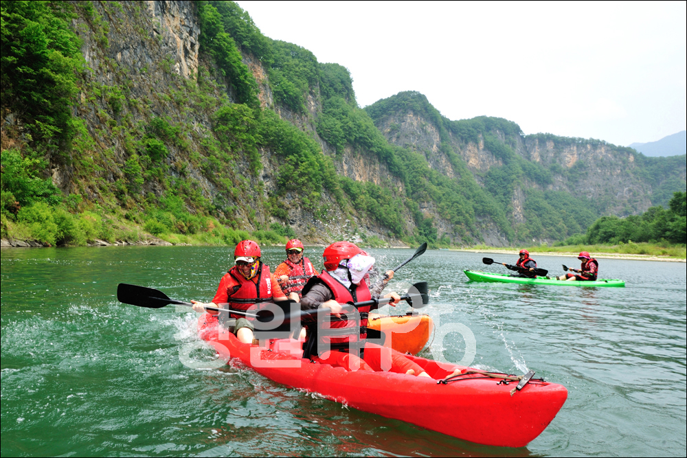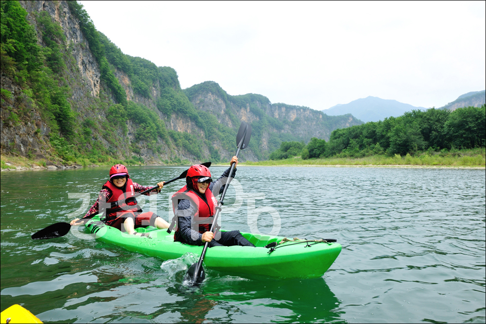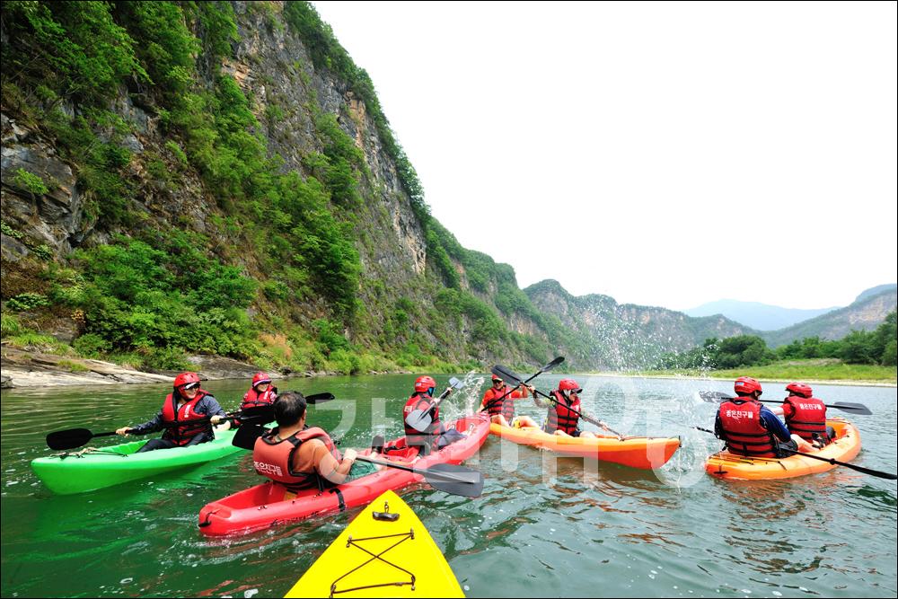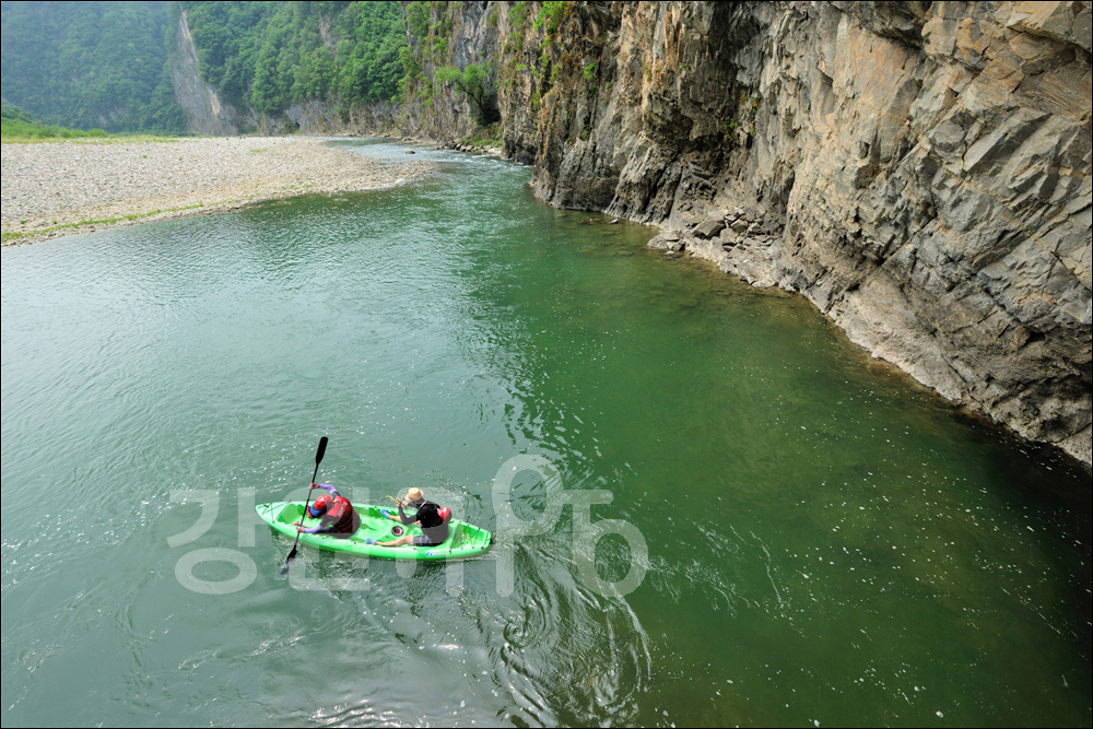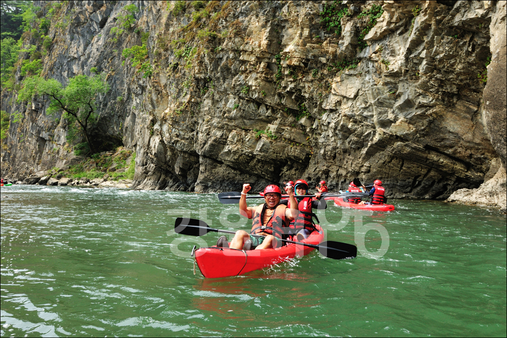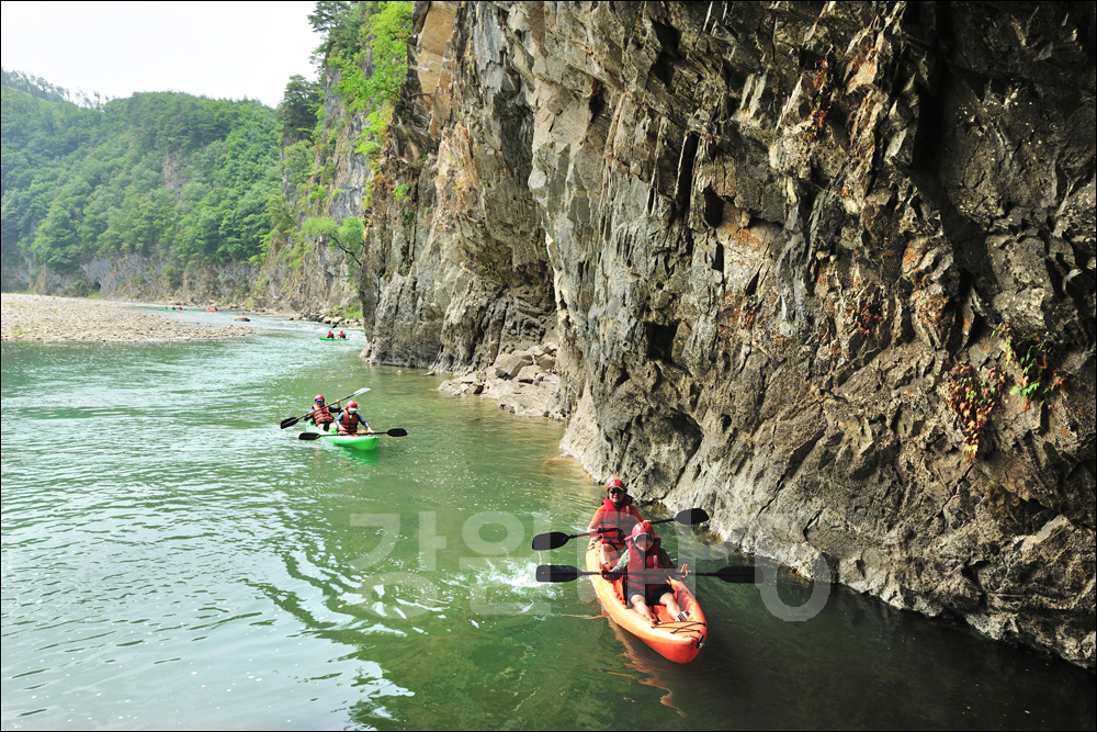 정선동강의 비경에 놀라고 동강에서 카약킹의 즐거움을 느끼며 동강을 질주하고 있다.