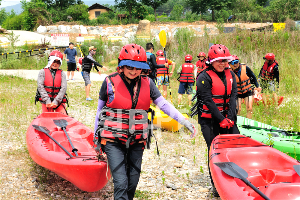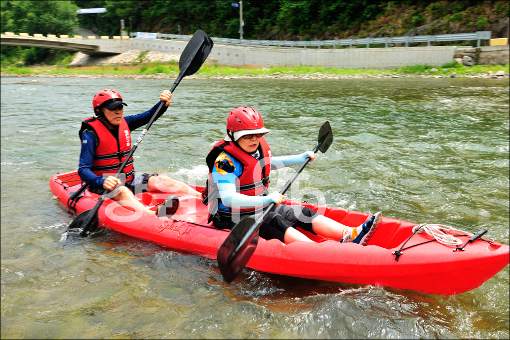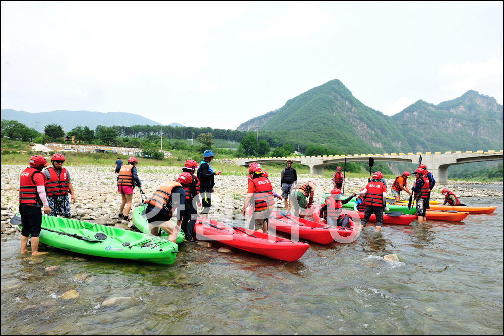 정선동강에서 카약킹이 출발하는 순간 긴장된 모습이다
