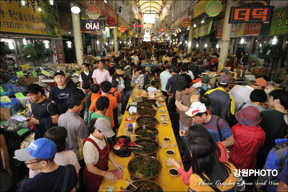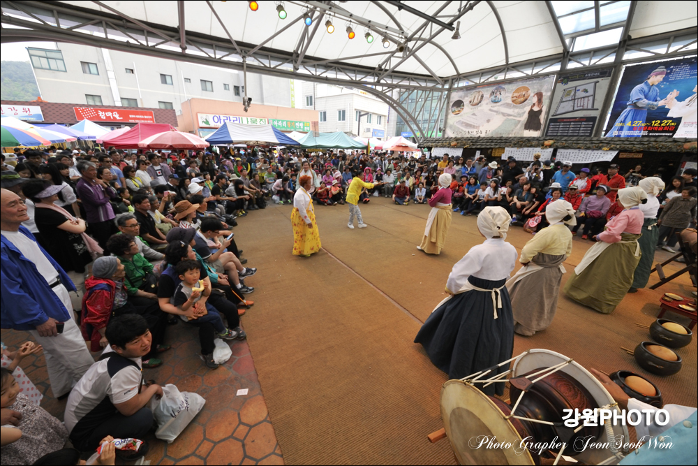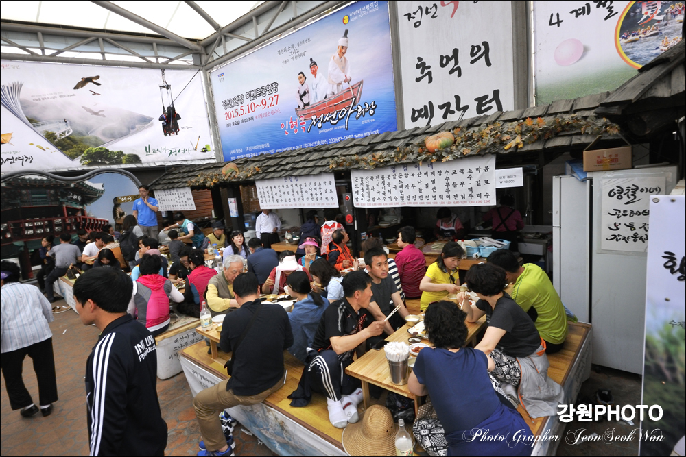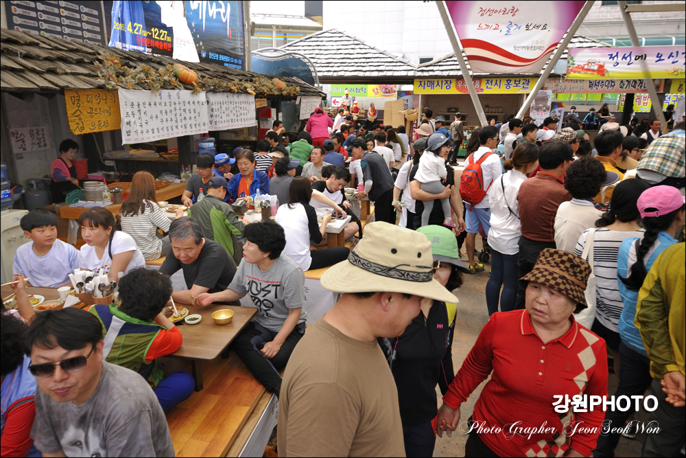 정선오일장에는 공연을 관람하는 관광객 정선음식을 맛보기위해 관광객들로 넘처나고 있다