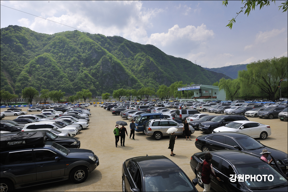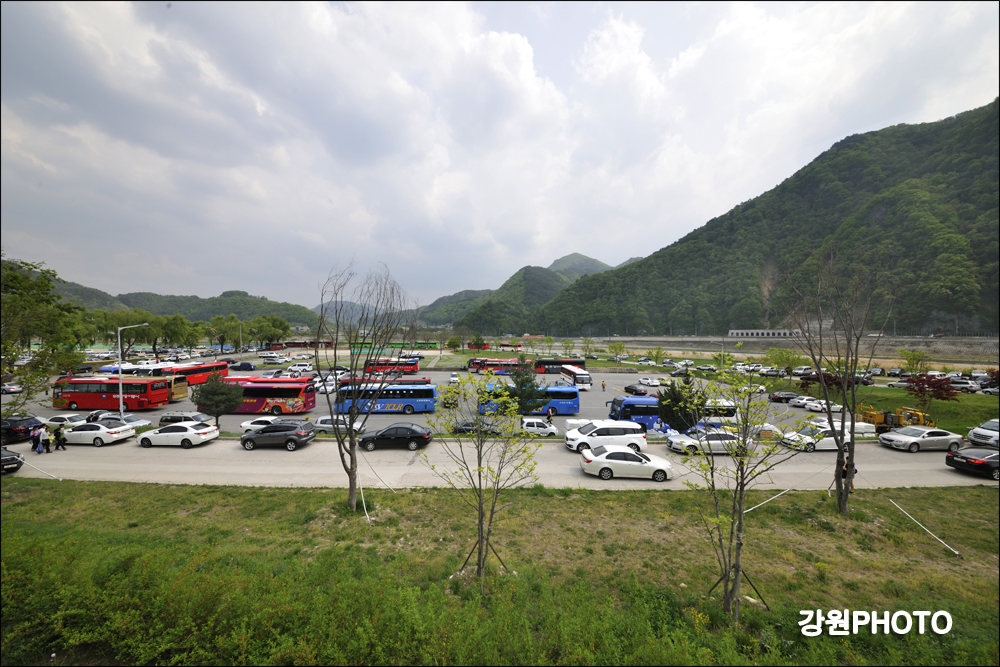 정선 공설운동장에는 마치 자동차 매매상사를 연상케하듯 관광객차들로 꽉 들어찻다