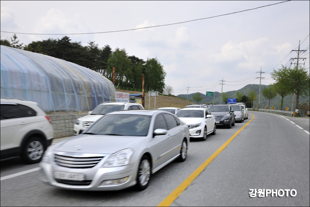 정선의 온사방이 관광객 자동차들로 물결을 이루고 있다
