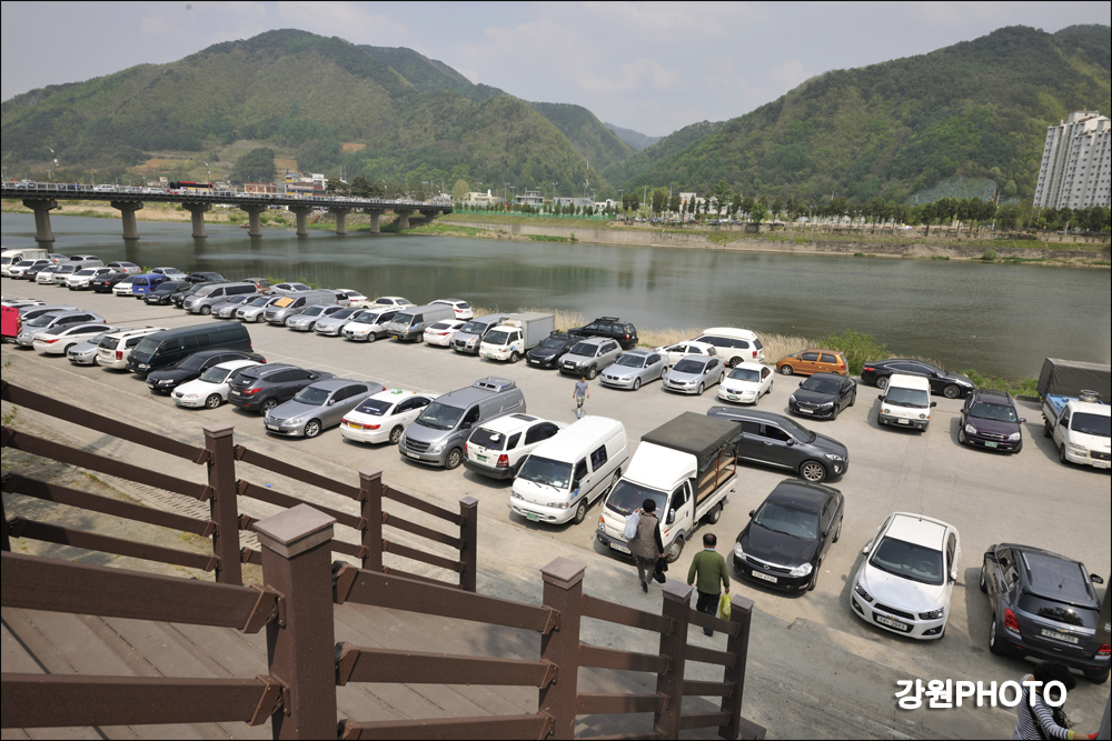 조양강 다리에는 끝도 없이 관광객 차들로 밀려 들어오고 있고 정선에 주차 할곳은