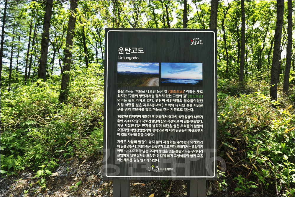 1960~1980년대까지 만항재에서 함백역(40Km)까지 석탄을 실어 나르기 위해 이 길을 만들었고 장대한 산중도로는 반세기 동안 대한민국의 산업화를 이끈 숨은 동력이었습니다. 운탄고도는 ‘석탄을 나르던 옛 길(運炭古道)’이라는 뜻도 있지만 ‘구름이 양탄자처럼 펼쳐져 있는 고원의 길(雲坦高道)’ 이라는 뜻도 가지고 있습니다.